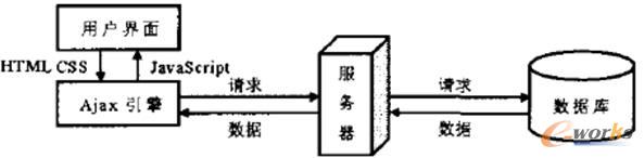 針對本文第一節(jié)提到的一系列問題, Ajax 技術(shù)的應(yīng)用為我們提供了更好的解決方案。Ajax 的工作原理相當(dāng)于在用戶和服務(wù)器之間加了一個(gè)中間層———Ajax引擎, 使用戶的請求與服務(wù)器響應(yīng)異步化, 并非所用的數(shù)據(jù)處理都交由服務(wù)器, 部分?jǐn)?shù)據(jù)或校驗(yàn)由Ajax 引擎處理, 當(dāng)需要向服務(wù)器讀數(shù)據(jù)時(shí).才向服務(wù)器發(fā)送請求,如圖1所示。這樣在整個(gè)過程中,只需要交換少量的數(shù)據(jù)。既減輕了服務(wù)器和網(wǎng)絡(luò)的負(fù)擔(dān),又加快了響應(yīng)速度, 縮短了用戶的等待時(shí)間。