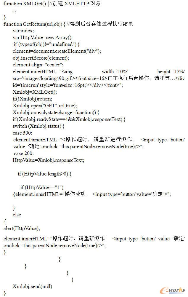 企業(yè)信息系統(tǒng)應(yīng)用中,往往在后臺處理許多復(fù)雜的業(yè)務(wù)邏輯,最常用的手段是調(diào)用數(shù)據(jù)庫后臺的存儲過程,為了不使靜態(tài)頁面長時(shí)間處于等待狀態(tài),可采用此方法:在前臺顯示Gif動畫,通過Ajax調(diào)用后臺存儲過程,關(guān)鍵代碼如下: