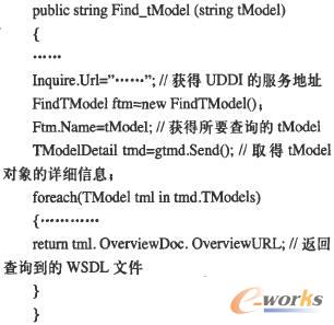 下面是系統服務引用模塊中根據tModel參數,尋找Web服務包裝器在UDDI中注冊的WSDL文件地址的部分代碼: