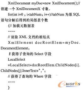 該模塊的主要功能是:將查詢各異構數據庫所返回的結果合為同一筆記錄,按照數據庫中間件系統與業務處理系統的接口進行封裝,最后返回給應用層。本系統仍然通過DOM技術對XML文件進行解析和合并。首先加載從服務結果中生成的XML文件,用DocumentElement方法得到需要合并的多個XML文件的根元素,然后根據服務結果中的XML文檔命名法,取計算為l的文檔為準,用ImportNode方法將其它XML文件中的數據合并到該文檔,最后根據元數據表與局部數據的映射文件,利用ModifyNodeName函數修改該文檔的節點,使其符合服務請求時查詢結果要求。實現該模塊的部分代碼如下: